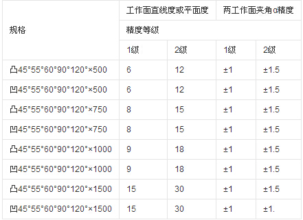 角度平尺分為凸、凹兩種形式。常用規(guī)格為:500凹 500凸 750凹 750凸 1000凹 1000凸 1500凹 1500凸。角度為:45度、50度、55度、60度。現(xiàn)在用戶使用中主要以55度較為普遍.